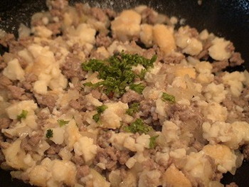 5.挽き肉を加えて炒め、肉の色が変わったら、3の潰した厚揚げを加えて炒める