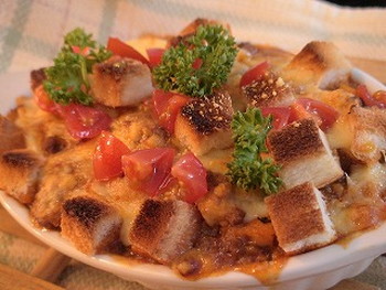 9.2の器に8のミートソースを入れて、ピザ用チーズ、食パンをのせてオーブントースターで4~5分ほど焼く