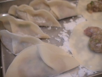 4.ふちに水をつけたら、中心部分にひだを1つだけ折ってギョーザを作る。作り終わったら片栗粉を引いたトレイに乗せていく。