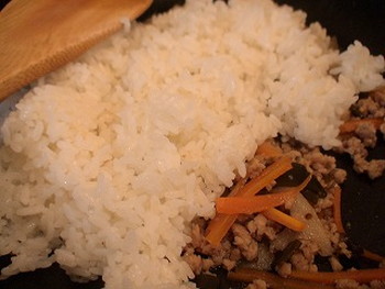 6.フライパンの具材がやわらかくなったら、混ぜ合わせて汁気を飛ばし、火を止めて温かいご飯、酢を加え入れよく混ぜ合わせる