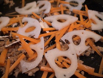 4.3のフライパンに、ニンジンを広げ、その上にレンコンをのせて敷きつめ、水を加え入れ蓋をして蒸し焼きにする