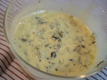 2.ボウルにマヨネーズ、1のタマネギ(水気を切る)、高菜漬け、卵黄を入れて混ぜてタルタルソースの完成(写真右)