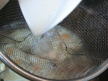 5.ボウルに薄力粉、牛乳を入れて泡立て器でよく混ぜて、ザルで漉しながら4のフライパンに加え混ぜる
