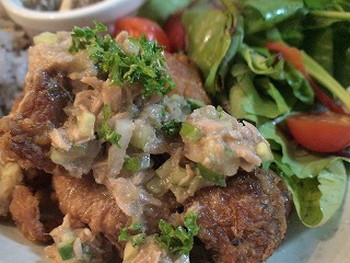 鶏肉にツナの冷や汁風ソース、美味しかったです(⌒~⌒) ベビーリーフもこのソースでバッチリ!マヨネーズは不要なくらいでした。本場、宮崎のチキン南蛮よりも、あっさりといただけて、おすすめのひと品です★★★