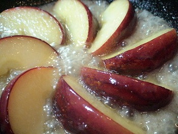 3.フライパンに、バター、砂糖を入れて中火にかけ、キャラメル色に溶けたら、1のりんごを加え、全体にからめながら火をとおす