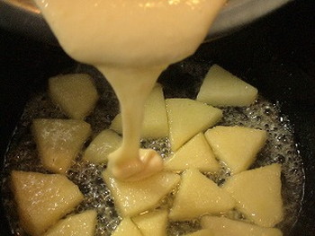 7.蒸しあがったら(水分が少し出てきたら)、砂糖を入れ軽く混ぜ、さらにりんごの上に4の生地 を流し入れて(写真右)、フタをして約8分~10分程弱火で蒸し焼きにする。