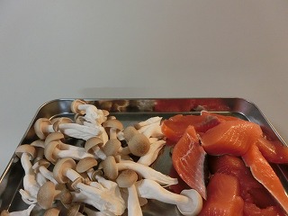 1、しめじ(1パック)は根元を除きほぐし、生鮭切り身(またはサーモン 2切れ)は骨を抜き1切れを3等分に切ります。