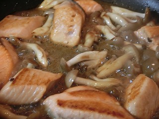 4、鮭の両面を焼き空いた所に、根元を除きほぐしたしめじ(1パック)を加えて2分ほど焼きます。