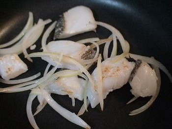 透き通ってきタラ、タラを加えて炒め合わせる。
