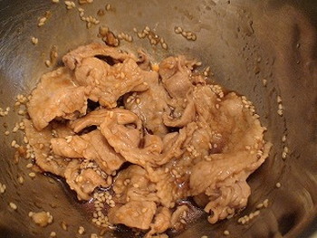 4.3のタレに豚肉を加え、しっかりタレを絡ませる(写真右)。続いて、キャベツ・青じそ・みょうがを加え混ぜ合わせる。