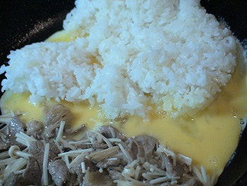 3.ニンニクを揚げた油(大さじ1)をフライパンに戻し牛肉を炒め、色が変わったらエノキをしんなりするまで炒める。ninnikuchahan2