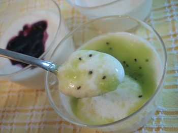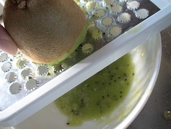 5、キウイフルーツの皮をむき、おろし金ですりおろす。砂糖を加えてキウイソースを作る。
