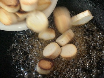 4.3のフライパンに2のお麩を入れてカラメルソースを絡めて、さらに1のアーモンドを加えてまぶし絡めて出来上がり