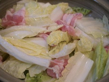 4.3の土鍋に白菜を入れ、手で豚肉とよく混ざり合わせる。日本酒を入れて蓋をし、火にかけ約10分煮る(写真右)