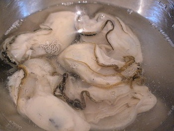 1.カキを塩水につけて、丁寧に表面の汚れを落とす。