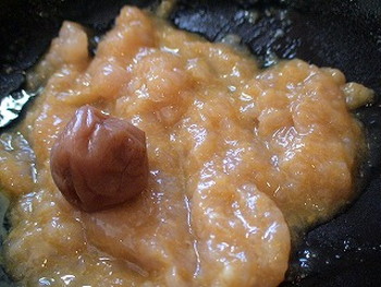 5.全体に色が変わってきたら、梅干しをつぶして、細かくちぎった青シソを加え入れて完成!(種を取り除いて下さい)