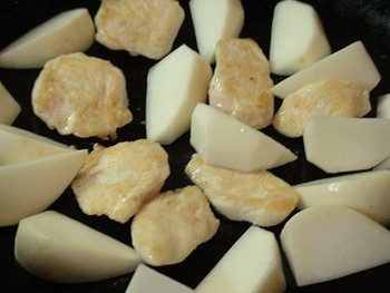 鶏肉を両面に焼き色がついたら、かぶ、ニンニクを入れて炒めてみました(写真右)。