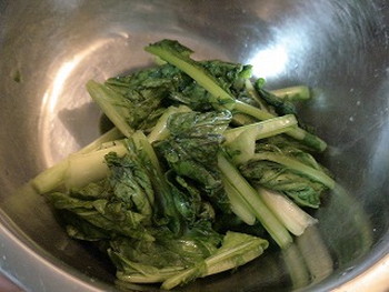 2.1で切り落としたかぶの葉を2,3cmくらいのざく切りにします。ボウルに入れて、塩もみします(写真右)。