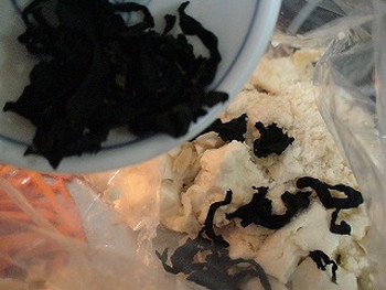 ※下ごしらえを全てポリ袋の中で行い、豆腐に残った水分も無駄にしない(乾燥わかめ・お麩が水分を吸う)