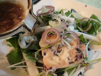 雑穀ご飯とお味噌汁、このサラダ風チャンプルーで、1人前222kcalとダイエットにはオススメの低カロリーレシピです。ちりめんじゃこ&梅干しの手作りドレッシングが、いい味だしてました~!