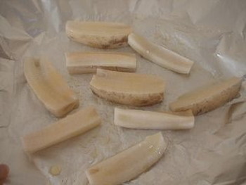 2.オーブントースターのトレイにアルミホイルをひき、その上に1のレンコンを並べて、オリーブ油を絡めて、塩で味付けをします。