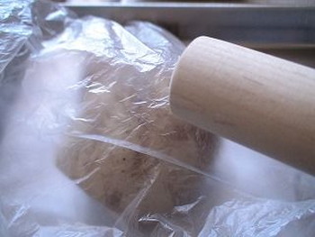 2.ポリ袋へ、切っていない丸ごとのレンコン(皮つきのまま)を入れて、麺棒で袋の上からレンコンを叩き潰します。