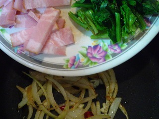 1.ホウレン草は茹でて食べやすい大きさに、タマネギは薄切り、ベーコンは1cm幅くらいに切ります。
