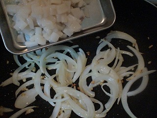 香りが出てきたら、玉ねぎを炒めます。