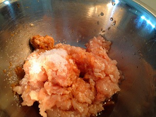 2.ボウルにひき肉(400g)、(A)のみそ(小1~1と1/2)、しょうが汁(小1)、みりん(大1/2)、しょうゆ(大1と1/2)、砂糖(大2)、片栗粉(大1)を入れ、手でよく練り混ぜます。