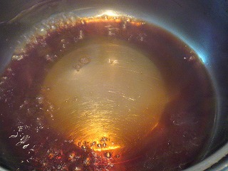 4.小鍋にしょうゆ(大2)、砂糖(大2)、みりん(大2)を合わせて火にかけ、煮立ったら弱火にして、軽くとろみかつくまで3~4分くらい煮詰めます。
