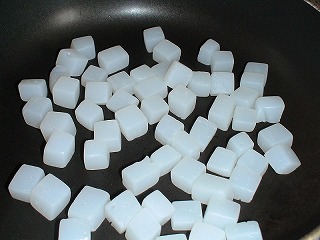 1.こんにゃくにフォークで穴をあけ、一口大に切って炒めます(から炒り)。