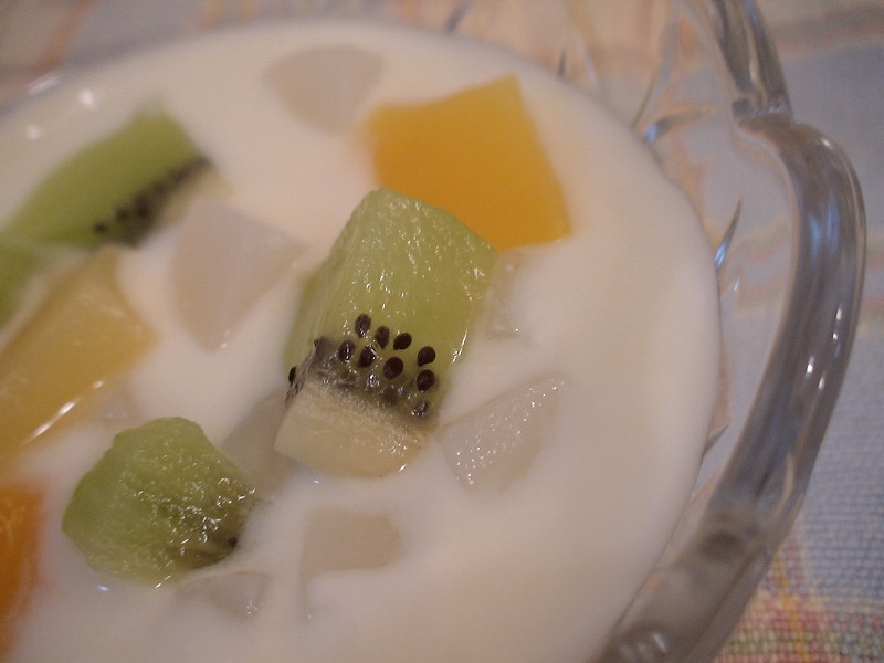 3.2の冷やしたこんにゃくと一口大に切った果物を器に入れます。