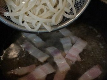 3.2の鍋に、温めたうどんを入れて温め、火を消します。1のソースを入れます。