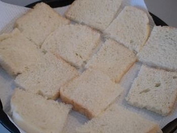 1.レンジ皿にキッチンペーパーを敷き、1cm幅に切ったフランスパンを並べる。