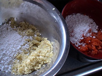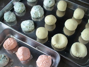 2.白玉粉を3等分にして、1のピューレ、水(各20~30ml)をそれぞれに混ぜ合わせて、耳たぶくらいのかたさにこねる。