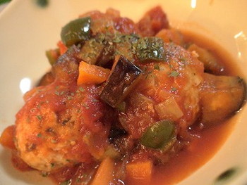 5.トマトソース、3のレンコン肉団子を湯きりして加え入れ、野菜がやわらかくなるまで煮込んだら出来上がり。