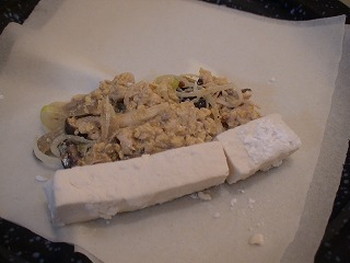 6.豆腐に片栗粉をまぶし、春巻きの皮に5の具材と一緒に包み、水溶き片栗粉でとめる