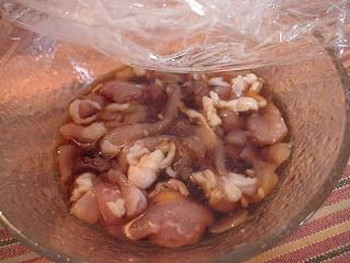 (写真右:私は、鶏もも肉を粗めに切りました)