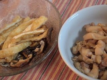 同じタレに干しシイタケ、油揚げを入れてラップをして2分加熱します。