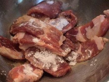 1.豚肉にしょう油・酒で下味をつけて、片栗粉をまぶします。