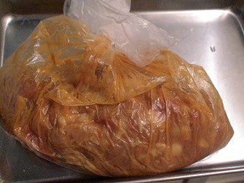 1.ポリ袋の中に豚コマ肉、玉ねぎ、ホールトマト、ニンニク、ショウガ、カレー粉、コンソメ、サラダ油を入れて、1分間よーく袋の中の材料を揉み込みます。