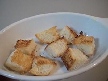 1.食パンは小さい一口大の角切りにし、天板に広げて220℃のオーブンに入れ、5~6分かけてこんがり焼く。