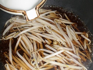 2.だし汁、みりん、しょうゆを合わせ、洗って水気をきったもやしを入れ、ふたをします。
