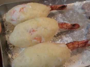 6.3の尾と一節を残したえび(8尾)に小麦粉をまぶし、5を8等分して尾が出るように包み込み(手に水をつけるとやりやすい)、衣の小麦粉の上に置く。