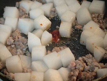 肉の色が変わったら大根を加え、火を少し強めてさらに炒める。mabodaicon1