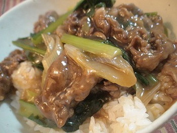 材料3つだけの(牛肉・小松菜・ねぎ)ささっと出来る丼ぶりレシピです。ごはんがすすむボリューム満点の中華丼でした。牛肉が“ちゅるん”として、のど越しよくやわらかく、切り落としの薄いお肉でも十分、美味しかったです(⌒~⌒)