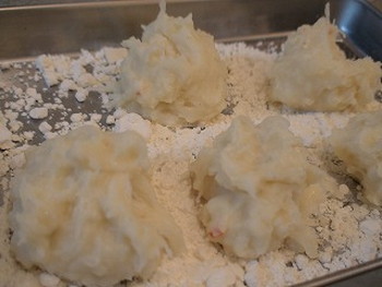 5.4をスプーンで小麦粉の中に具を落とし、続いて卵液の中に入れ、最後にパン粉を付けながらボール状に形を整えるkanicreamimo1