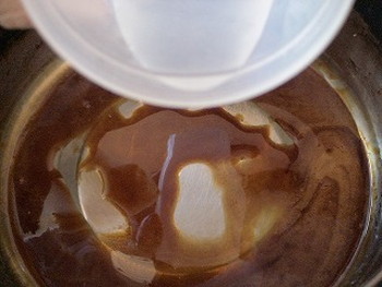 8.カラメル色に色づいたらお湯を加え(写真右)、鍋の底についた砂糖を溶かす