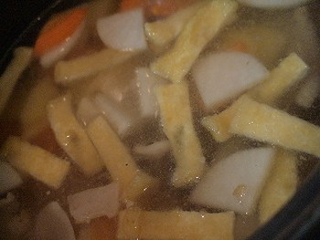 4.こんにゃく・油揚げを加え炒め、だし汁を加え煮立ったらアクを取り、野菜がやわらかくなるまで約10分煮る(写真右:こんにゃく無しです)