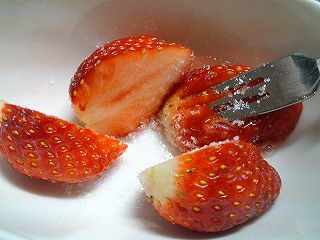 スプーンなどでつぶし、グラニュー糖(大さじ2~3)を加え混ぜいちごソースの出来上がり